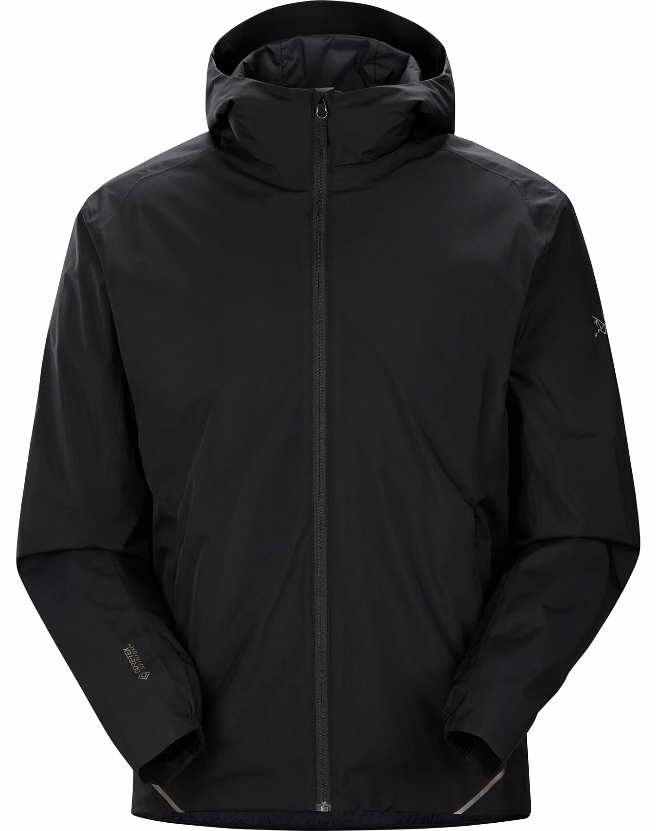 Vindtett og vanntett GORE-TEX Infinium-materiale er stille og fleksibelt med en myk innside. Passformen er litt videre for å gi plass til en ekstra genser eller vest. De forbøyde ermene med kile under gir høy bevegelighet, og kragen beskytter hals og nakke uten å forstyrre.