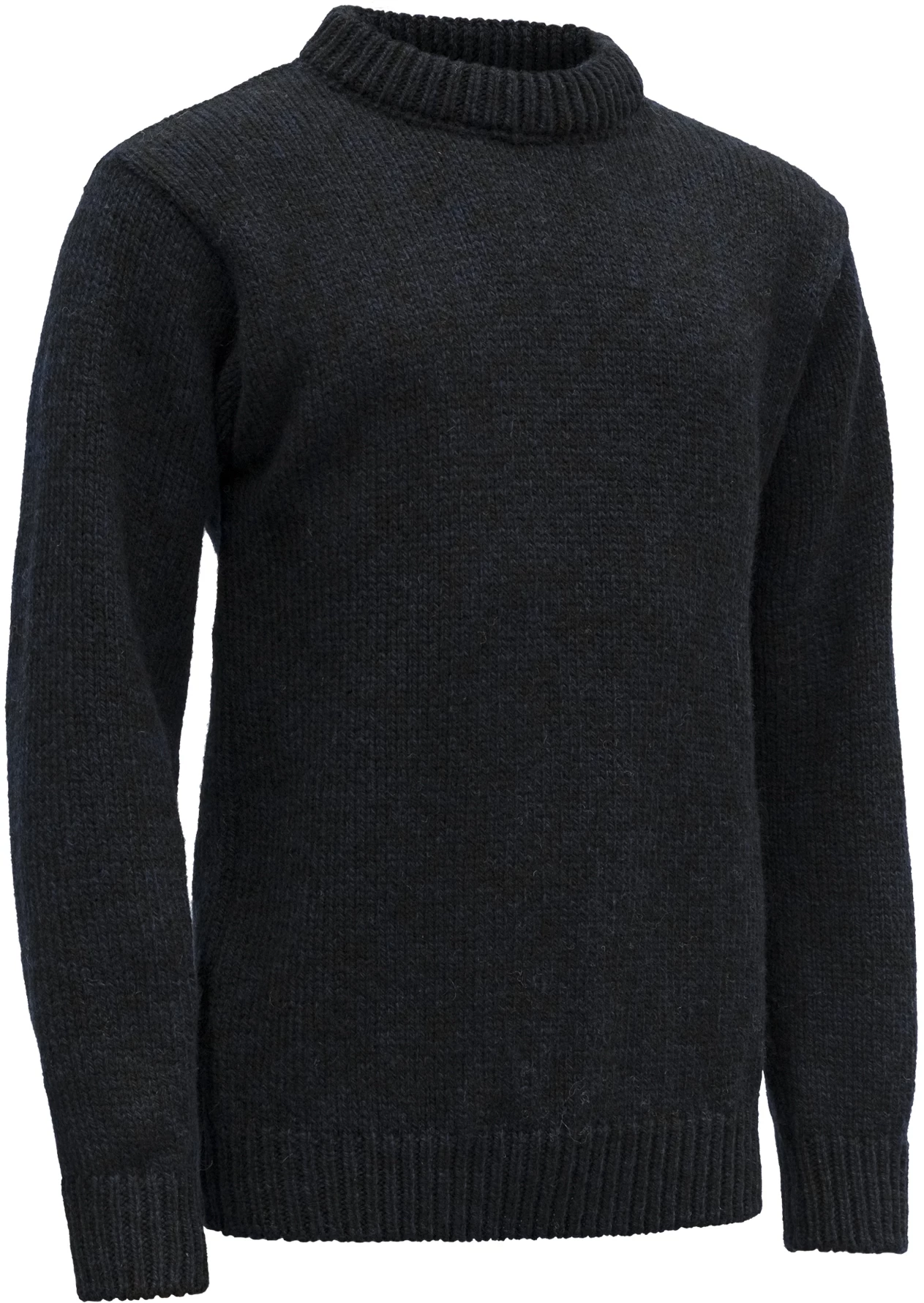 - Rund hals, ribbestrikket nederst og på ermene