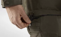 Anorakken er sydd i vind- og vannavvisende G-1000 Eco av resirkulert polyester og økologisk bomull, med ekstra sterk G-1000 HeavyDuty på skuldre, ermer og i den forlengede ryggenden. Materialer og detaljer er valgt for å minimere miljøpåvirkningen – for eksempel er de fleste lærdetaljer laget av gjenvunnet avfall.