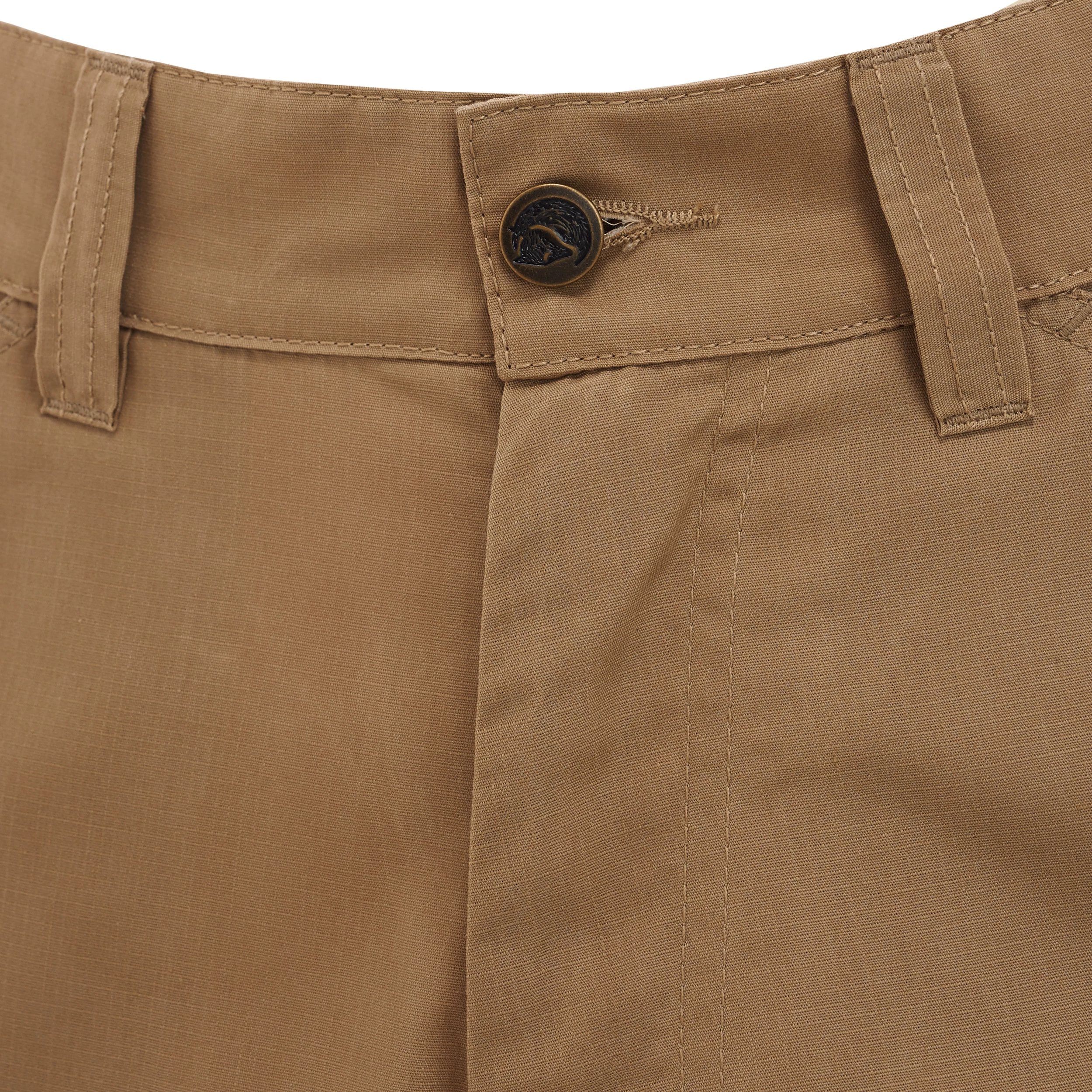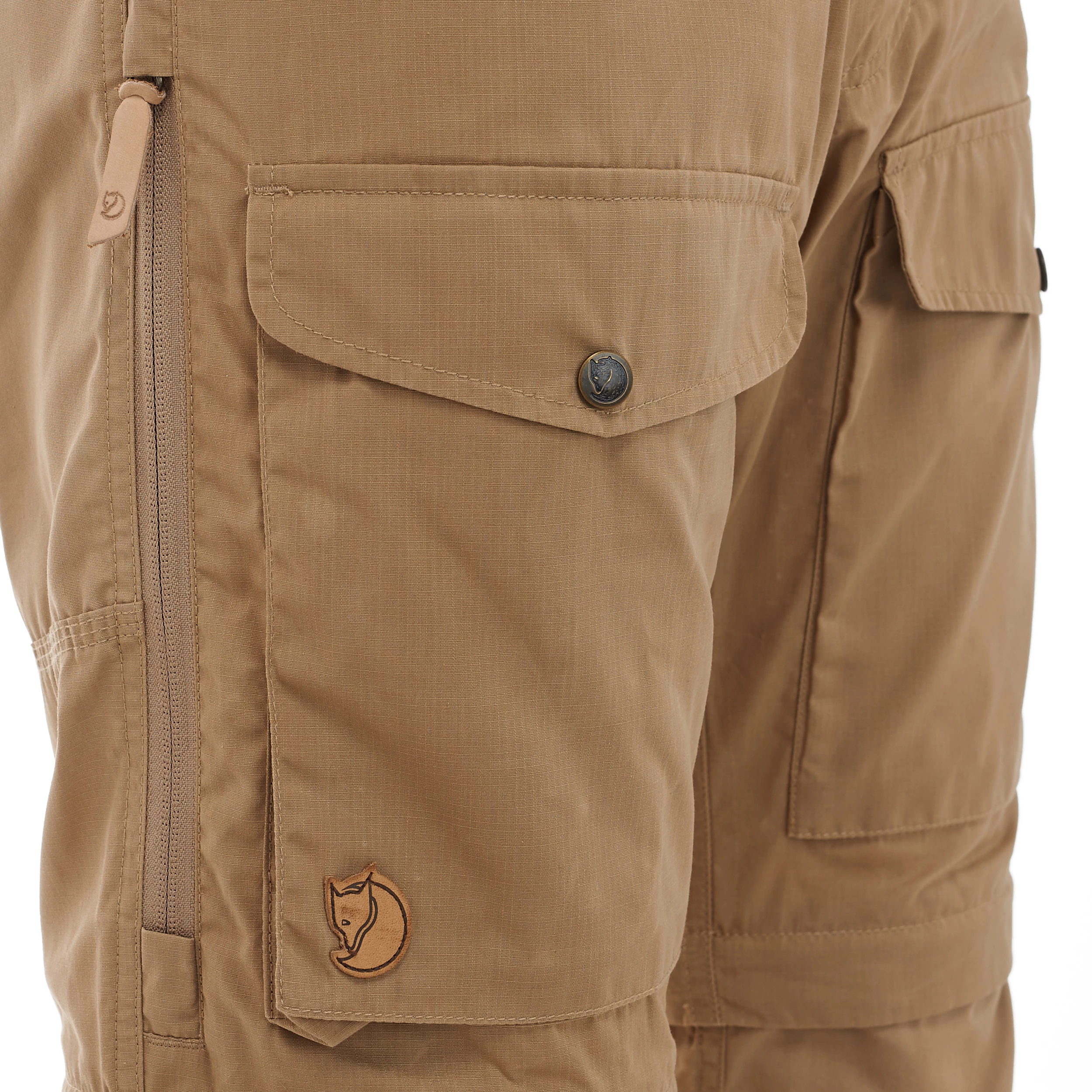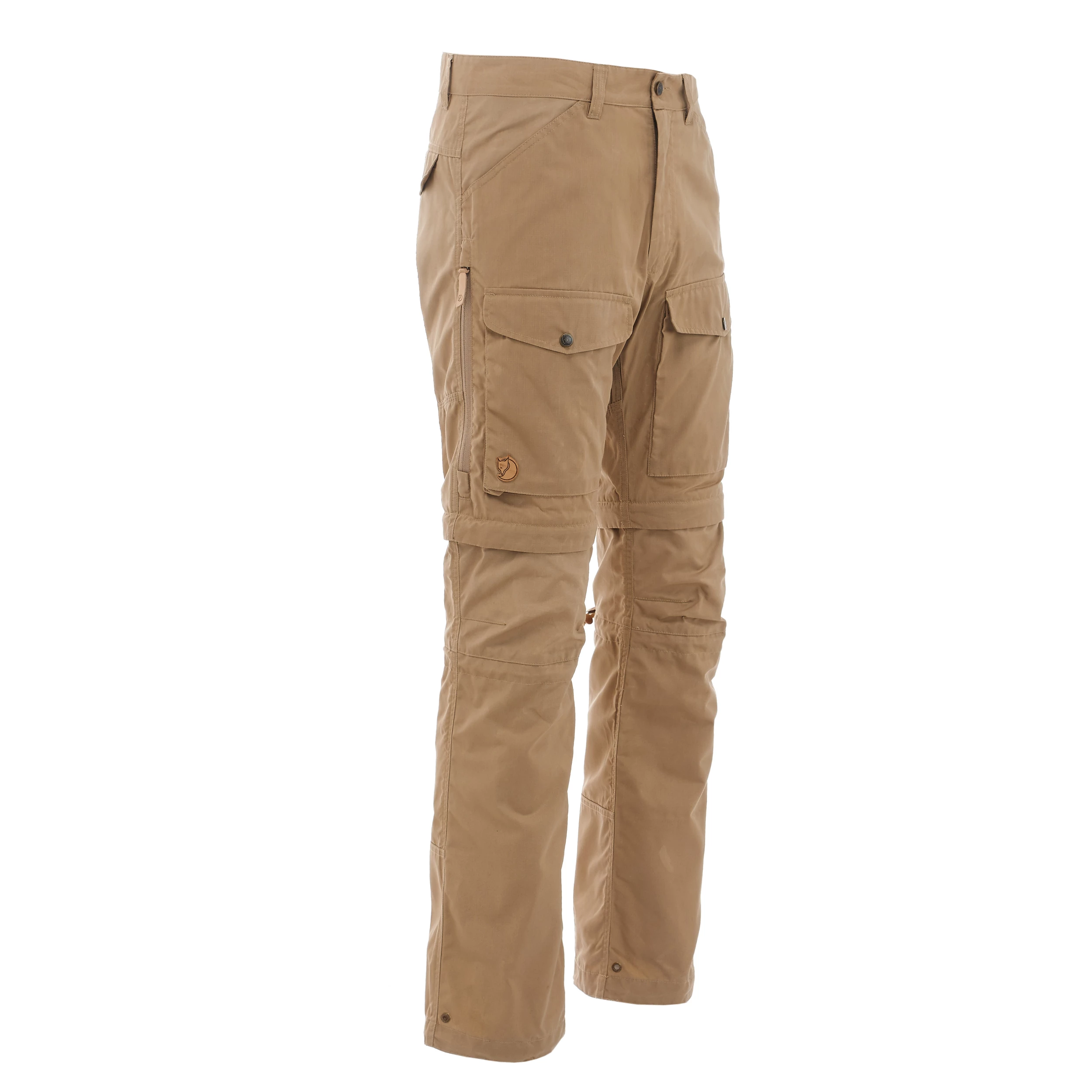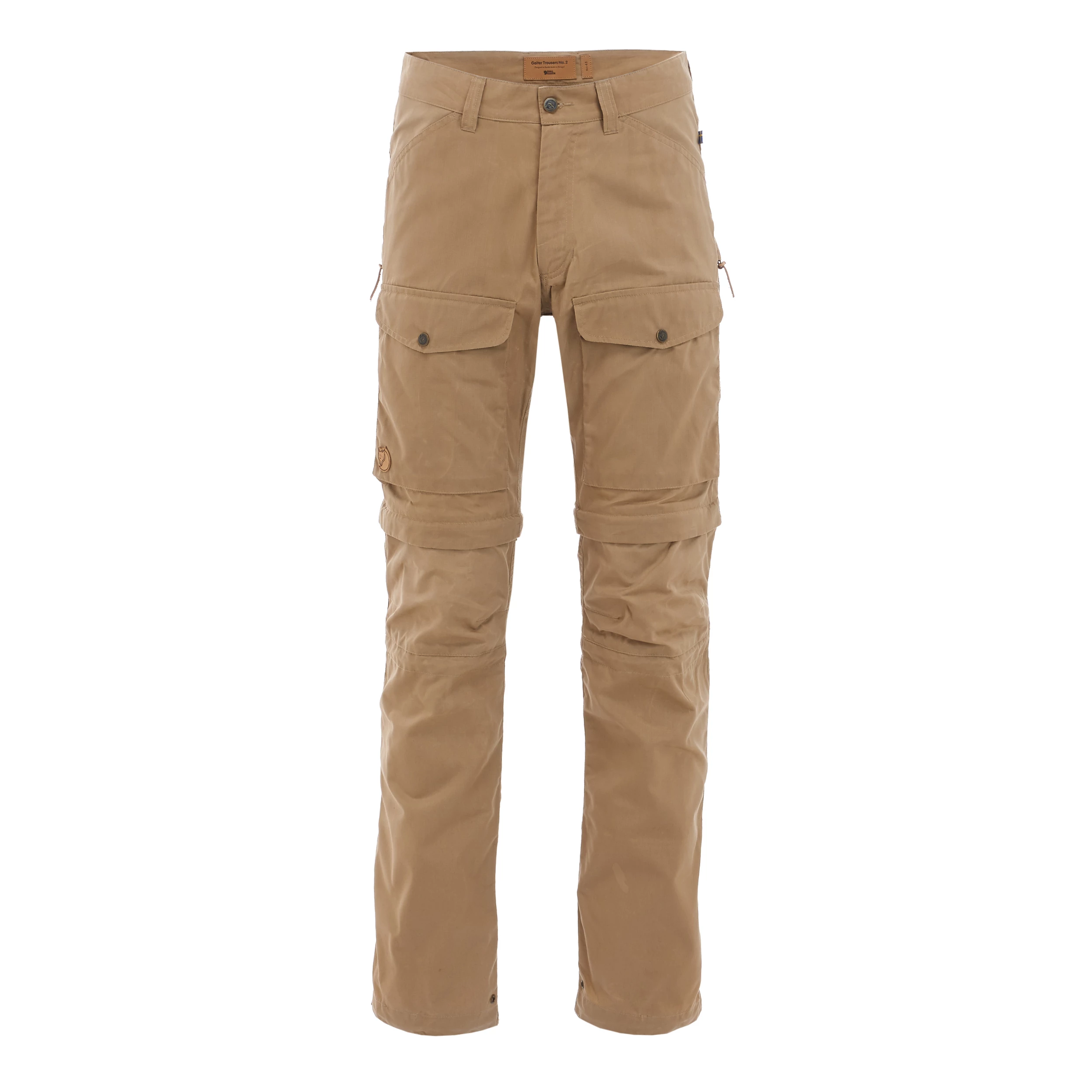 Knepartiet på den løsnede delen brettes inn og en snørejustering i knefoldet regulerer vidden øverst, samtidig som en støvelkrok hakkes i støvelen og holder gamasjen på plass nederst. I tillegg til støvelkroken, er det en løpesnorjustering og et par løkker til å feste liner eller stålbøyler i for ytterligere forankring ved støvelen. Glidelåser langs lårene gir ekstra ventilasjon. Det er to romslige benlommer med lommeklaff samt et par håndlommer og baklommer med knappet lommeklaffer.