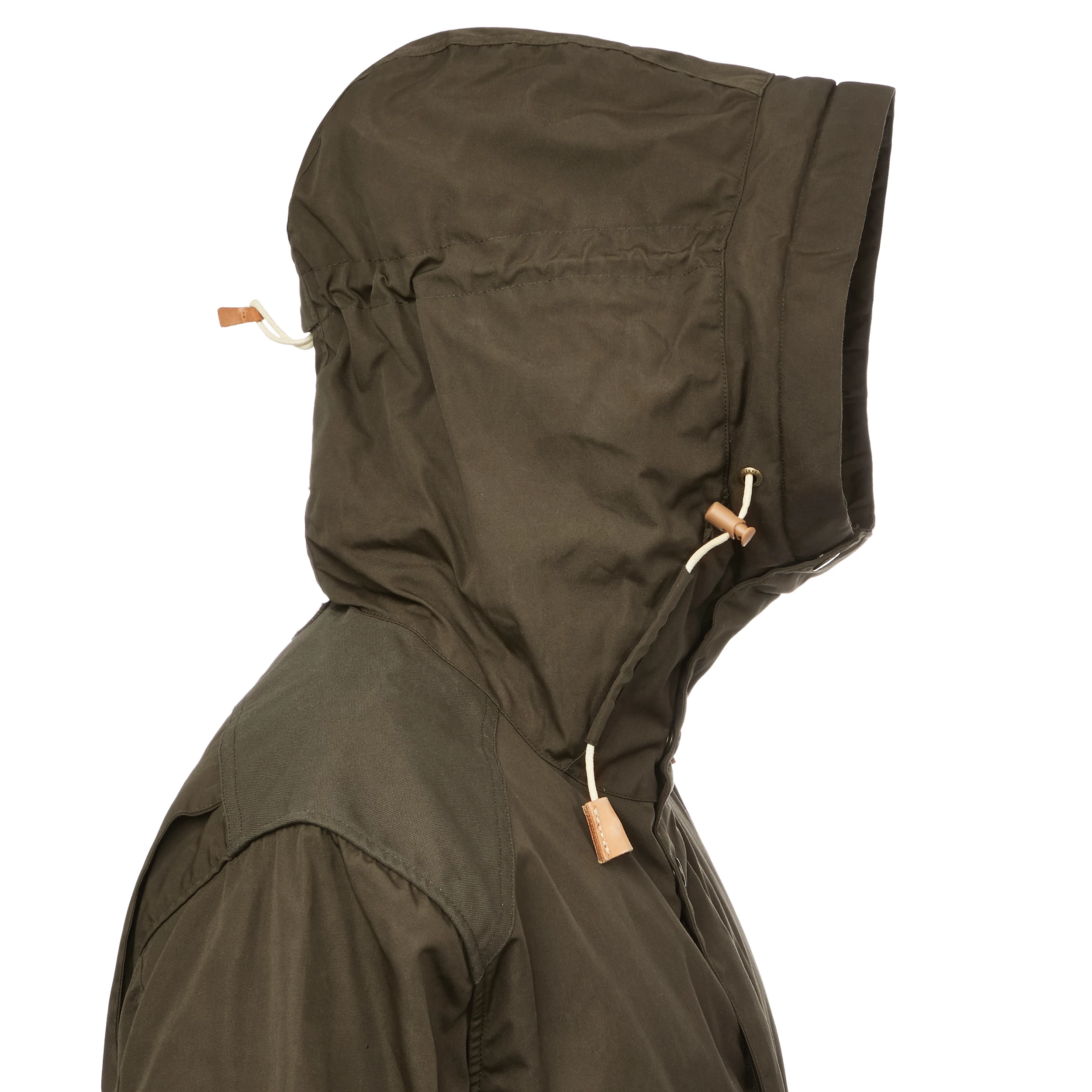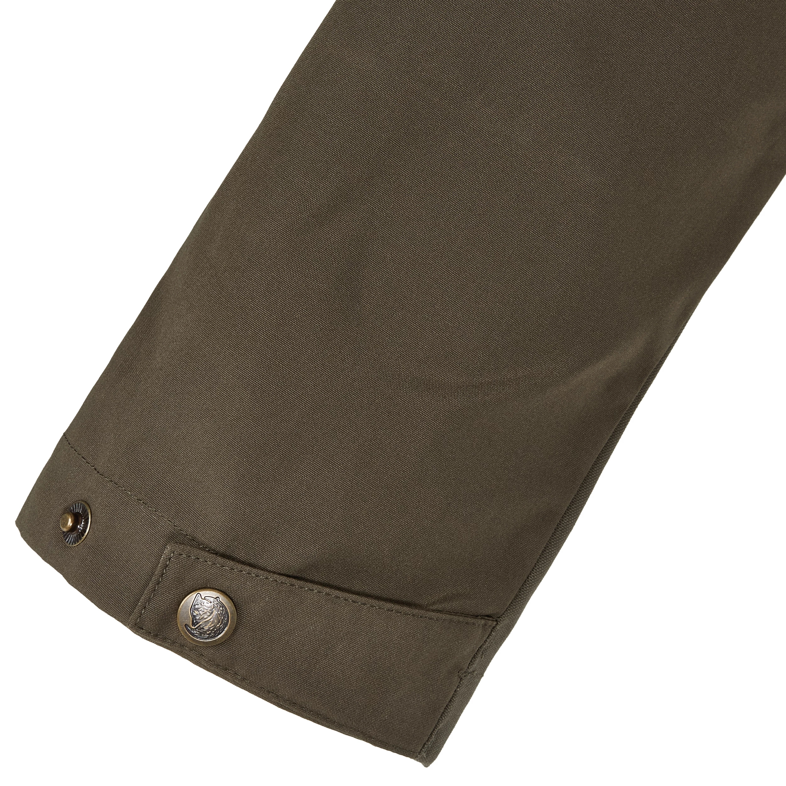 Jakken er sydd i vind- og vannavvisende G-1000 Eco av resirkulert polyester og økologisk bomull, med ekstra sterk G-1000 HD på skuldre, ermer og lommer. Materialer og detaljer er valgt for å minimere miljøpåvirkningen – for eksempel er de fleste detaljene i lær laget av avskjær som er tatt vare på – og for at det skal være enkelt å bytte ut utsatte deler, etter mange års bruk.
