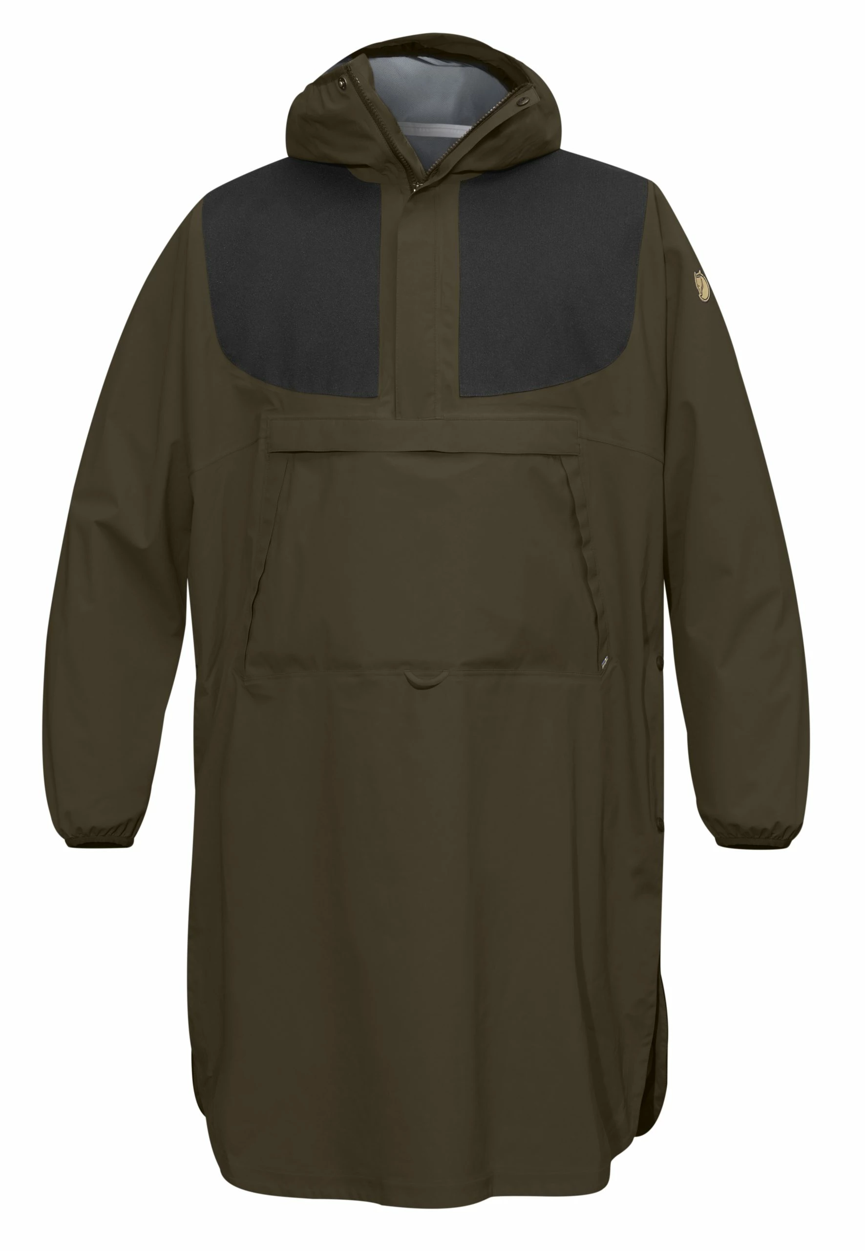 Ponchoen har ermer for enkel håndtering av våpen og annet utstyr, mens trykk-knapper holder den sammen i siden og gjør av- og påkledningen enklere. En flik på brystet gir beskyttelse til kikkertsikte, kamera og annet utstyr som ikke tåler vann, men fliken kan rulle sammen og gjemmes i en lomme. Langt snitt holder bena tørre, men fronten kan rulles opp og festes med et bånd når du trenger å forflytte deg. En regulerbar hette med liten skjerm og en romslig kengurulomme som raskt gir varme til frosne fingre. Mykt, elastisk kantebånd nederst på ermene.