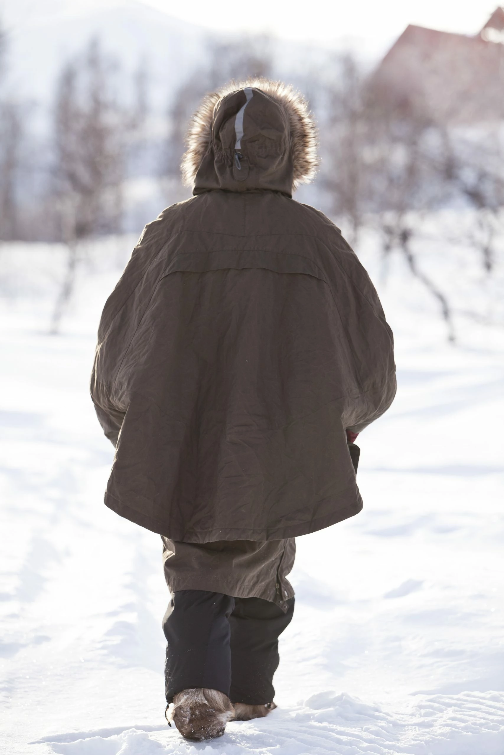 Smart knelang cape inspirert av samenes allsidige og praktiske Luhkka. Fungerer like bra som et enkelt ytterplagg om høsten og våren som forsterkningsplagg over vanlige vinterklær på kalde vinterdager – slik samene alltid har båret den. Over vanlige skallplagg gir den en fleksibel beskyttelse mot kulde og kald vind, og eventuell snø ristes raskt av når du kommer innendørs.