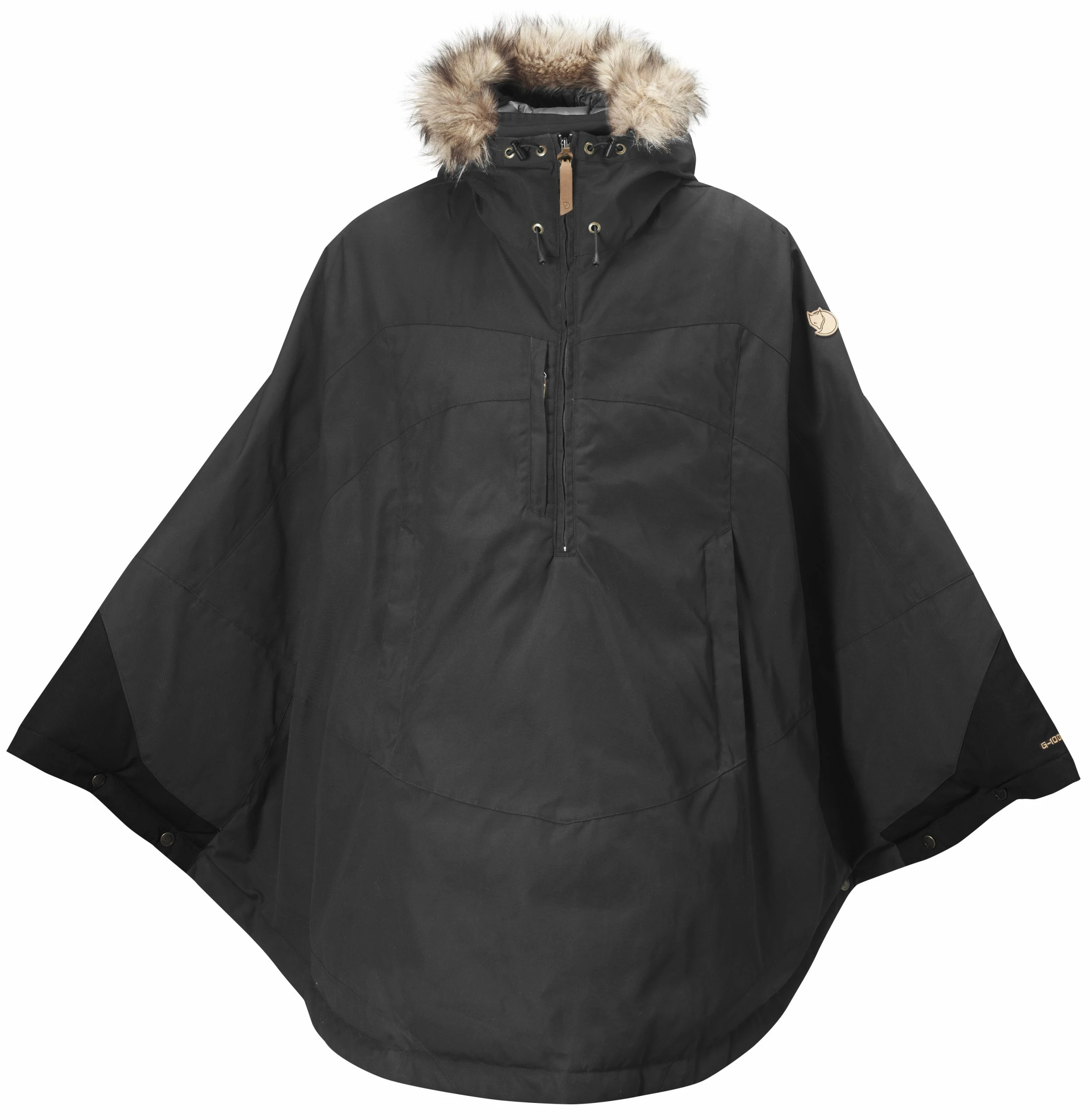 Materialet er slitesterkt, vind- og vannavvisende G-1000 som er utstyrt med et tynt syntetisk fôr for ekstra varme. Capen har en fast, justerbar hette med avtakbar pelskant i syntetisk stoff og refleksbånd på baksiden av hodet. Glidelåsen foran går halvveis ned på brystet. I åpningen er det en kile i G-1000 med myk fleece på innsiden. Rett ved siden av er det en brystlomme, og lengre ned på magen en kengurulomme med en liten lomme for mobiltelefon på innsiden. Trykknapper ved håndleddene holder plagget på plass når du beveger deg. Glidelåsglidere og detaljer er i naturfarget skinn.