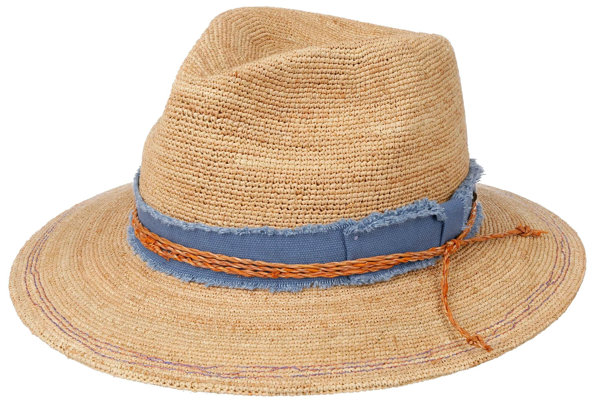 Stråhatt med fargerikt bomullsbånd. Match med luftige linbukser eller cityjeansen. Bremmen skråner ned foran og bak og er rett på sidene.